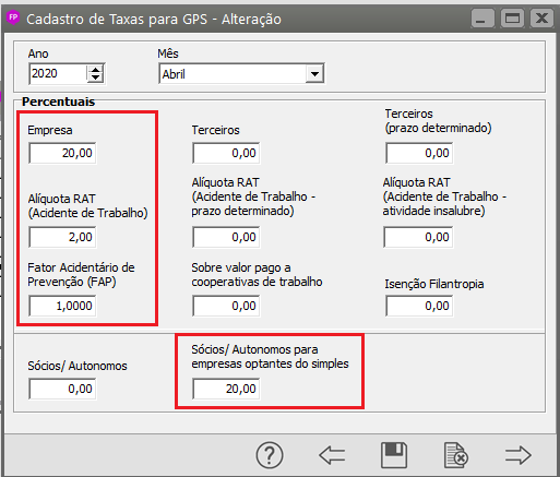Será necessário cadastrar as alíquotas patronal e RAT a serem calculadas . Em casos de sócios/Autônomos deverá informar no campo específico.